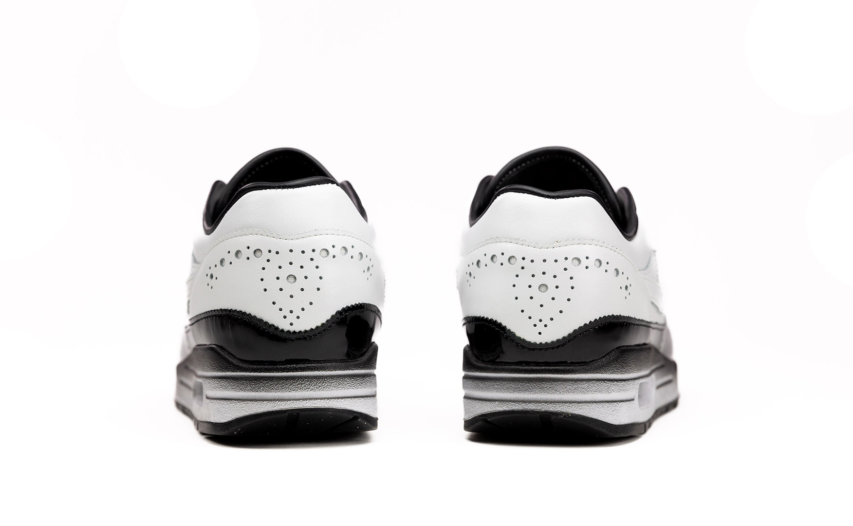 Crafted from premium white leather and black patent, the Gala exudes timeless class. Perforated patterns and scalloped edges add a refined touch to the design, while the lining features a soft leather lining for comfort. The red insole nods to the sophistication of a red bowtie, while black waxed laces complete the polished look. The finishing detail is a fade on the midsole, transitioning from black to white, adding depth to this unique masterpiece.